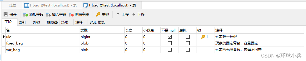 `fixed_bag` blob NULL COMMENT '玩家的固定背包,容量固定',