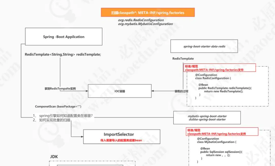 的jar包,jar中定义了RedisConfiguration,当启动的时候spring会自动装载RedisConfiguration,那spring是如何知道配置类在哪里的呢?RedisConfiguration类的路径放在了classpath*META-INF/spring.factories的文件中,spring会加载这个文件中配置的configuration