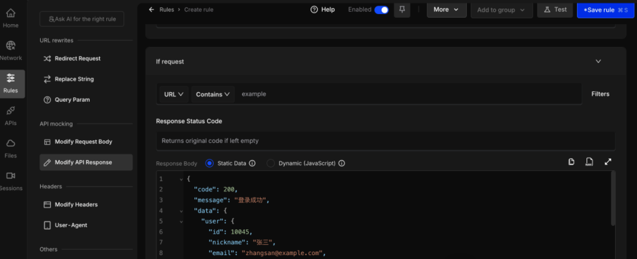 支持动态拦截 API 请求并直接返回你自定义的响应数据,即便后端接口暂未完成,也能快速搭建前端页面。