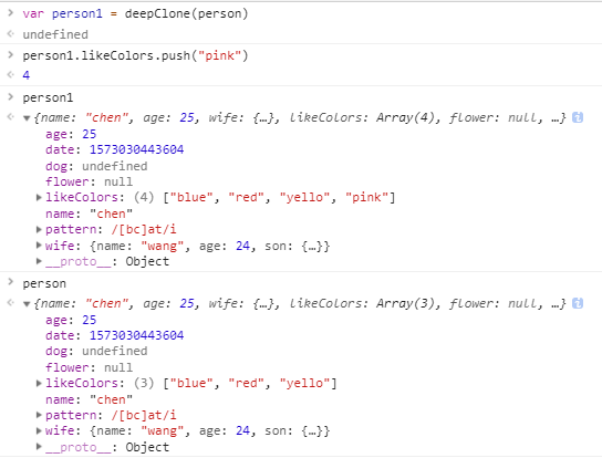 var person1 = {}; clone(person,person1); person1.likeColors.push("black"); console.log("person color:" + person.likeColors); console.log("person1 color:" + person1.likeColors);