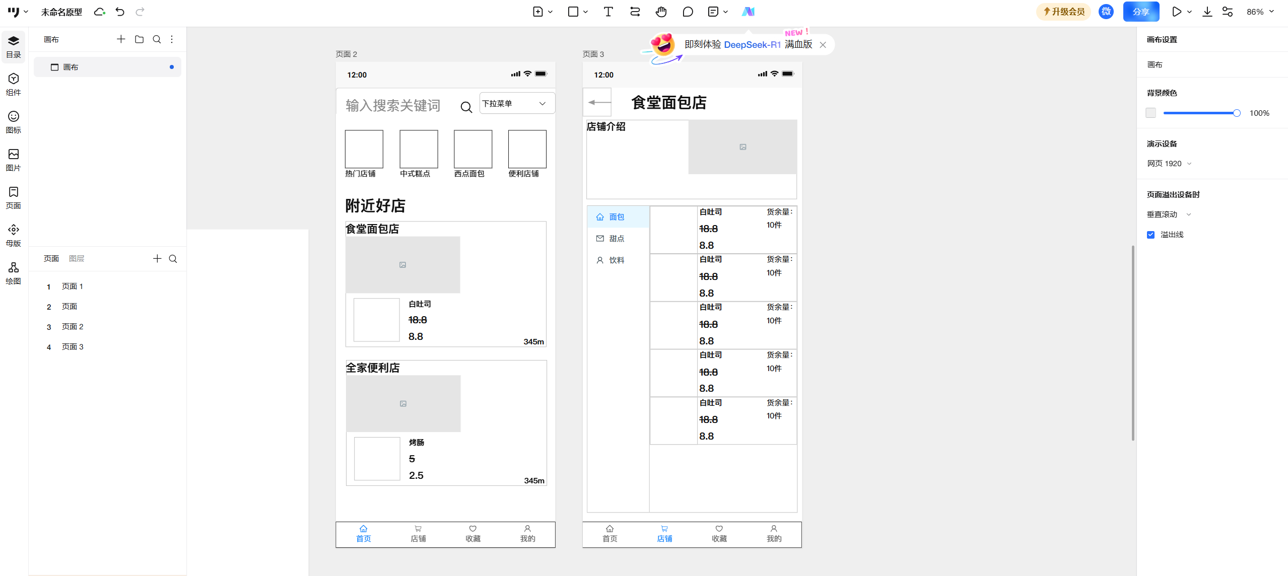 原型模式:切换到 Prototype 面板,定义页面跳转逻辑和交互动画。