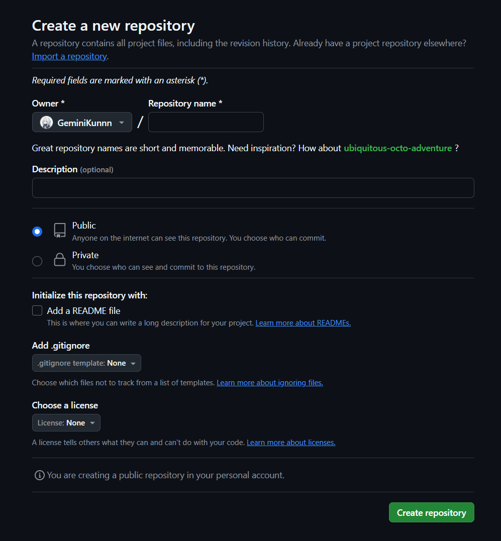- 填写仓库名称、描述,并选择仓库的可见性(公开或私有)。