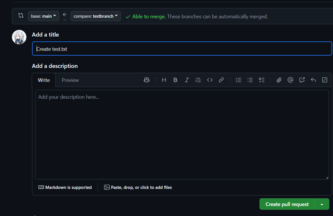 开发完成后,可以将分支合并回主分支。GitHub 提供了简单的 Pull Request 功能,来帮助我们进行代码审查和合并。