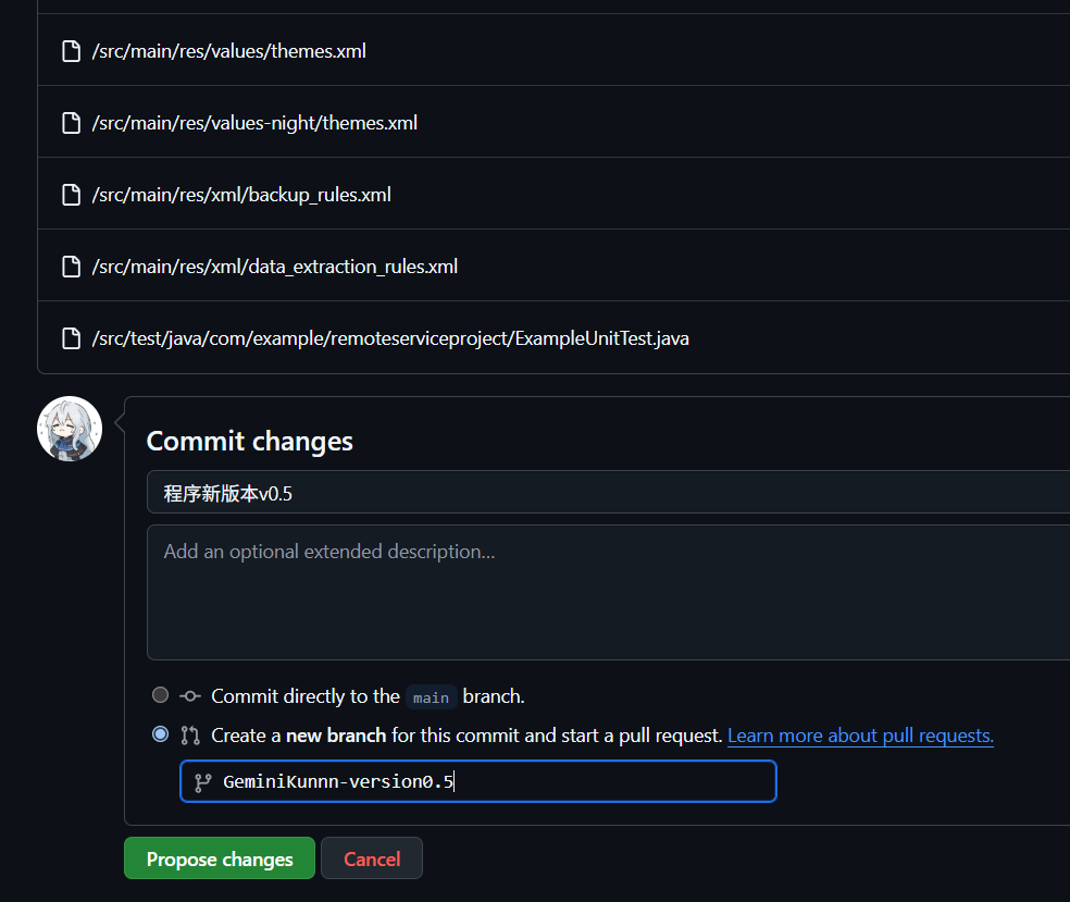 在程序开发一段时间后,我们进行了一次大更新,新增了许多文件,但是由于担心兼容性的问题,因此在上传文件的时候,选择了上传至新分支,命名为version0.5