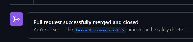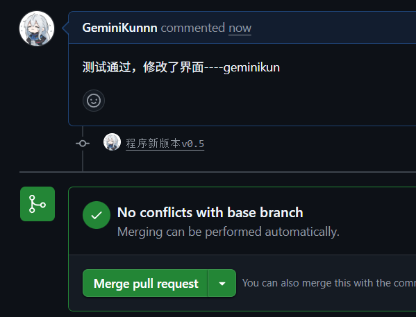 通过一段时间的检查后,发现上传的文件没有与主分支冲突,可以安全加入,因此点击pull requests进行分支合并,将临时分支合并进入主分支。并且在合并操作中记录了操作者和一些信息