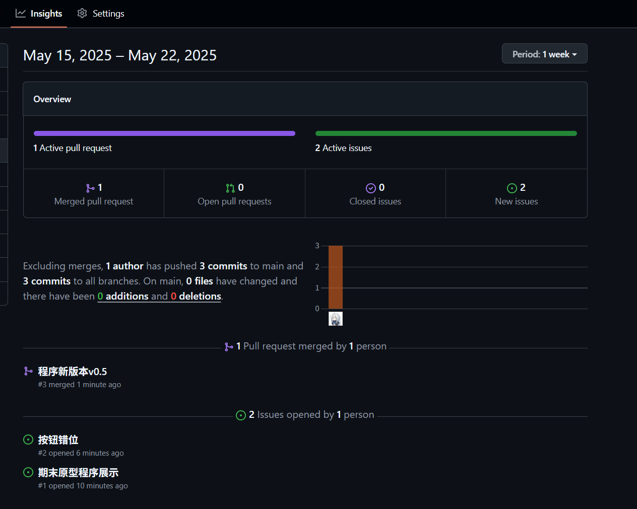 在insights界面中,我们可以直观的看到谁对项目做了哪些贡献,以此来公平的确定期末分工