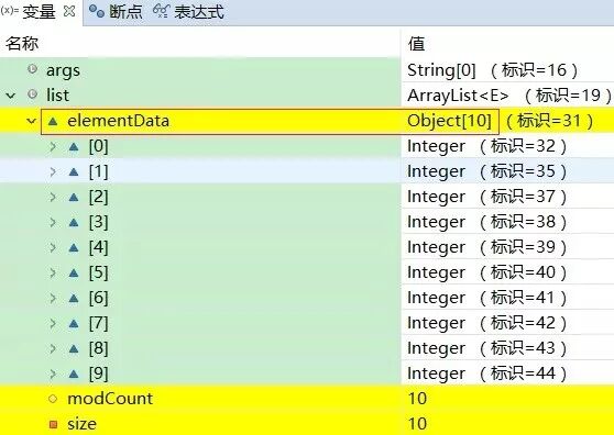 注意看图,elementData在断点1时标识是29,在断点2和断点3处的标识都是31,而在断点4时标识46,这说明elementData引用变量前后一共指向了三个不同的数组对象。也就是说,elementData并没有真正的扩容,而是创建了一个容量更大的数组对象来替代之前的数组,并且复制之前的数组内容。