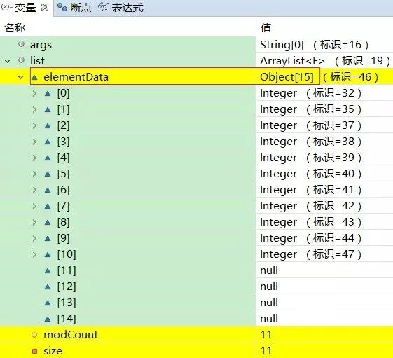 断点4:添加第11个元素,即超出了原数组长度。elementData长度扩容为15,即第二次以后的扩容,长度为原长度的1.5倍。