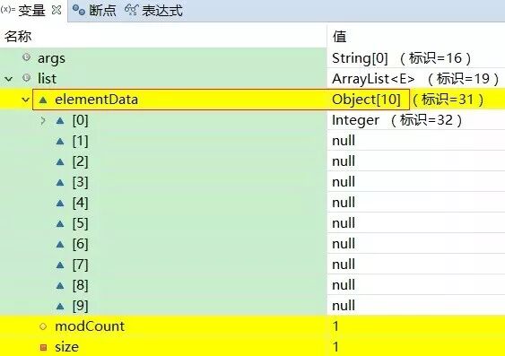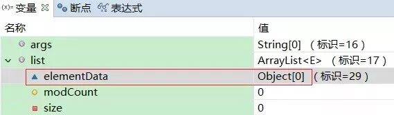断点1:list的数组参数elementData的值为Object[0],表示数组初始长度为0。