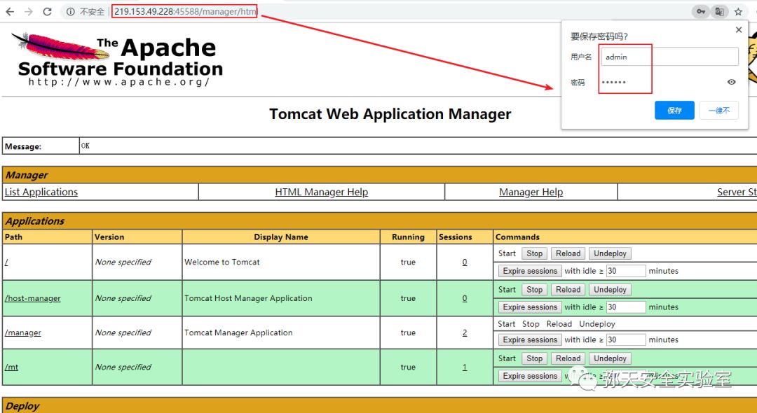 1、靶机xxx有一个Tomcat服务,默认为8080端口,浏览器访问:http://219.153.49.228:40033/manager/html