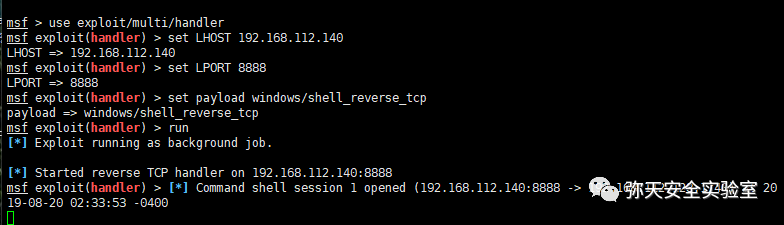 打开kali中的msf 设置exploit 和payload,随后设置 lhost 和 lport, IP 是 192.168.112.140,端口是 8888,最后输入 exploit 或者 run,监听过来的 shell。