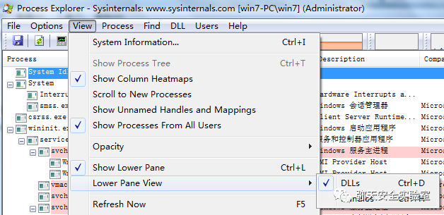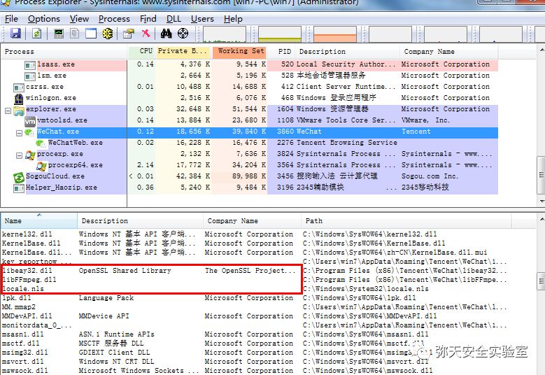 在 Win7 虚拟机中打开微信登录窗口,需要扫描登录的窗口即可;然 后开启 ProcessExplorer,在运行程序列表中找到微信,然后在菜单栏中找“View”—>“LowerPaneView”—>“DLLs”,或者 ctrl+d, 接下来可以看到微信登录页面调用的动态链接库 如下图所示