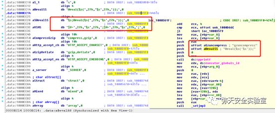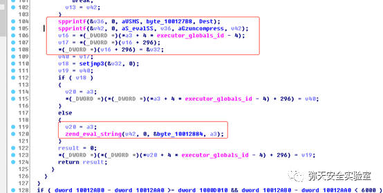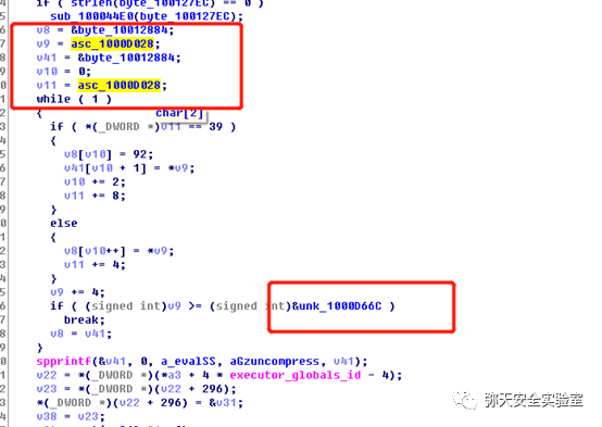 这里拼接了一个 @eval(gzuncompress('%s'));的代码 ,是调用gzuncompress方法解密执行某些代码,没解密前的代码来自asc_1000D028 到unk_1000D66C这个部分,拼接好的字符串放在v42处。
