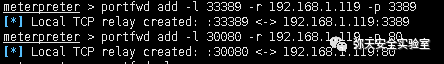 3 meterpreter > portfwd add ‐l 30080 ‐r 192.168.1.119 ‐p80