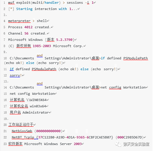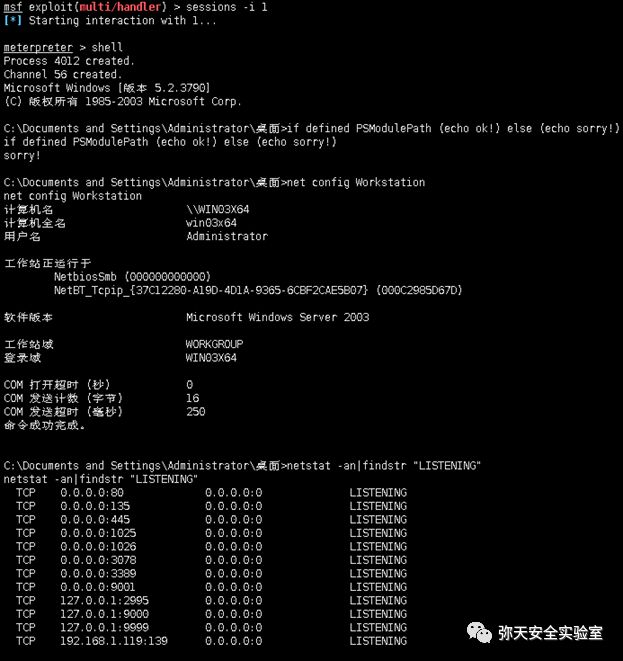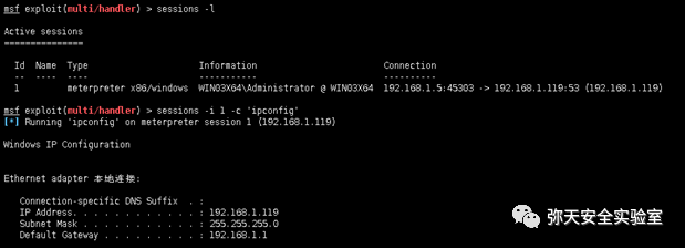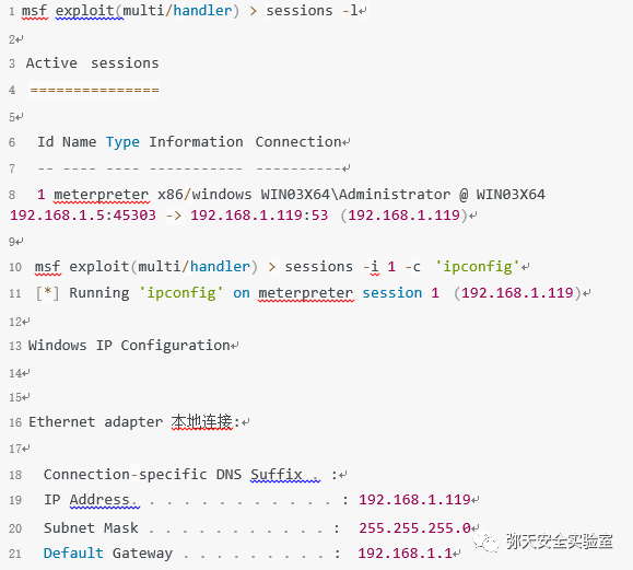 Sessions -l查看所有msf的连接,看到一条连接到windows 03通信,是从192.168.1.1:455303到192.168.1.119:53