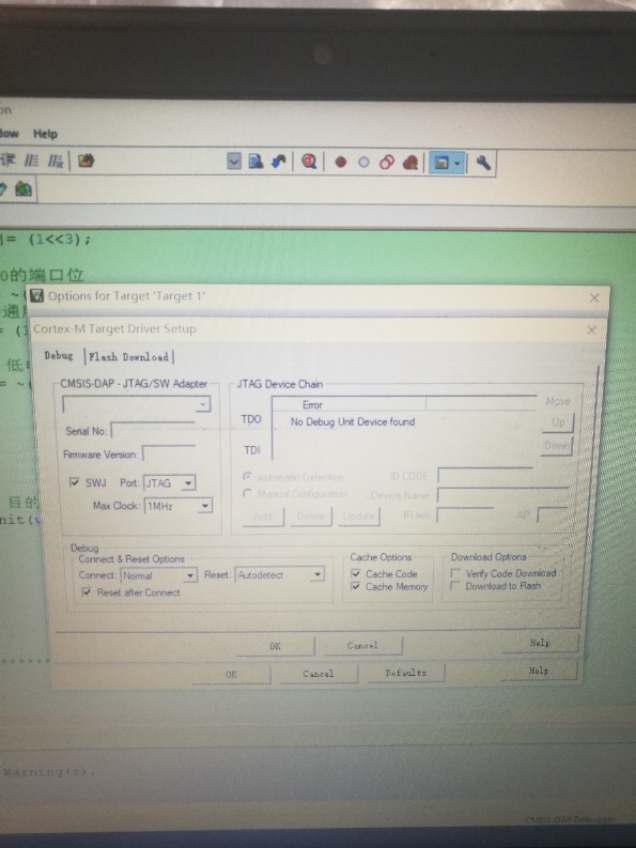 第一次用DAP下载器下载代码,Keil不识别(如图一)