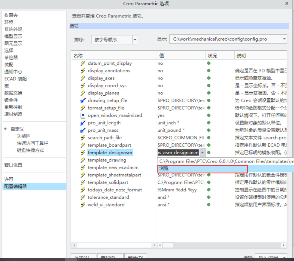 2、找到 template_designasm 名称,点右侧倒三角,浏览自己的 creo 安装路径"C:\Program Files\PTC\Creo 6.0.1.0\Common Files\templates\"找到 “mmns_asm_design.asm” 模板,打开