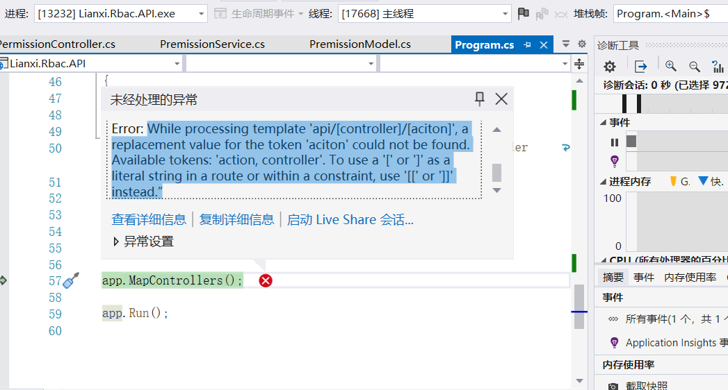 第二个:在处理模板“api/[controller]/[actionon]”时,找不到令牌“actionon”的替换值。可用令牌:'action, controller'。要在路由或约束中使用'['或']'作为字面值字符串,请使用'[['或']]'代替。当试图激活' lianxin . rbac . services . userservice '时,UserRepository'。