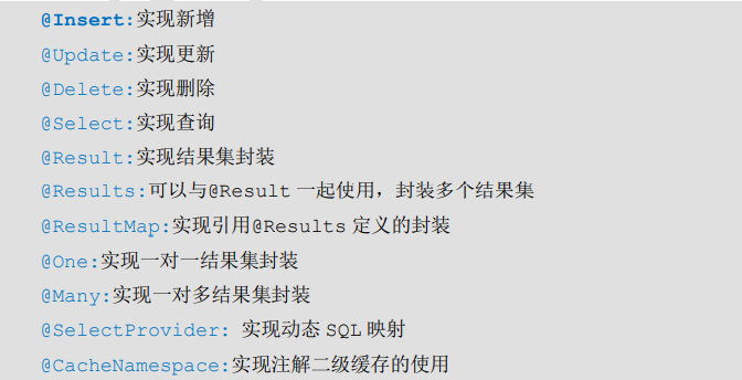 @Results 注解 代替的是标签<resultMap> 该注解中可以使用单个@Result 注解,也可以使用@Result 集合 @Results({@Result(),@Result()})或@Results(@Result()) @Resutl 注解 代替了 <id>标签和<result>标签 @Result 中 属性介绍: id 是否是主键字段 column 数据库的列名 property 需要装配的属性名 one 需要使用的@One 注解(@Result(one=@One)())) many 需要使用的@Many 注解(@Result(many=@many)())) @One 注解(一对一) 代替了<assocation>标签,是多表查询的关键,在注解中用来指定子查询返回单一对象。 @One 注解属性介绍: select 指定用来多表查询的 sqlmapper fetchType 会覆盖全局的配置参数 lazyLoadingEnabled。。 使用格式: @Result(column=" ",property="",one=@One(select="")) @Many 注解(多对一) 代替了<Collection>标签,是是多表查询的关键,在注解中用来指定子查询返回对象集合。 注意:聚集元素用来处理“一对多”的关系。需要指定映射的 Java 实体类的属性,属性的 javaType (一般为 ArrayList)但是注解中可以不定义; 使用格式: @Result(property="",column="",many=@Many(select=""))