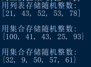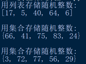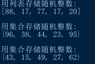 1 mport random 2 print('用列表存储随机整数:') 3 ls=[random.randint(1, 100) for i in range(5)] 4 print(ls) 5 print('\n用集合存储随机整数:') 6 s1={random.randint(1,100)for i in range(5)} 7 print(s1) 8 print('\n用集合存储随机整数:') 9 s2=set() 10 while(len(s2)<5): 11 s2.add(random.randint(1,100)) 12 print(s2)