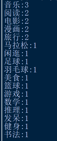 1 datas = {'2049777001': ['篮球', '羽毛球', '美食', '漫画'], 2 '2049777002': ['音乐', '旅行'], 3 '2049777003': ['马拉松', '健身', '游戏'], 4 '2049777004': [], 5 '2049777005': ['足球', '阅读'], 6 '2049777006': ['发呆', '闲逛'], 7 '2049777007': [], 8 '2049777008': ['书法', '电影'], 9 '2049777009': ['音乐', '阅读', '电影', '漫画'], 10 '2049777010': ['数学', '推理', '音乐', '旅行']} 11 m={} 12 for i in datas.values(): 13 for j in i: 14 m[j]=m.get(j,0)+1 15 x=list(m.keys()) 16 y=list(m.values()) 17 z=[(y[i],x[i]) for i in range(len(x))] 18 for j in sorted(z,reverse=True): 19 print(f"{j[1]}:{j[0]}")