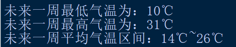 1 temperatures= [['2022-04-18', '星期一', '10', '22'], 2 ['2022-04-19', '星期二', '10', '22'], 3 ['2022-04-20', '星期三', '12', '25'], 4 ['2022-04-21', '星期四', '13', '28'], 5 ['2022-04-22', '星期五', '16', '31'], 6 ['2022-04-23', '星期六', '19', '31'], 7 ['2022-04-24', '星期日', '19', '27']] 8 i=[] 9 j=[] 10 for h in temperatures: 11 i.append(eval(h[2])) 12 a=min(i) 13 j.append(eval(h[3])) 14 b=max(j) 15 f'int(sum(i)/7)℃~int(sum(j)/7)℃' 16 print(f'未来一周最低气温为:{a}℃') 17 print(f'未来一周最高气温为:{b}℃') 18 print(f'''未来一周平均气温区间:{int(sum(i)/7)}℃~{int(sum(j)/7)}℃''')