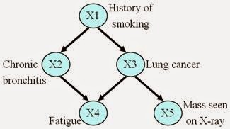 例如在图中可看到,吸烟影响肺癌、肺癌影响疲倦、肺癌也影响 X-ray 的结果。