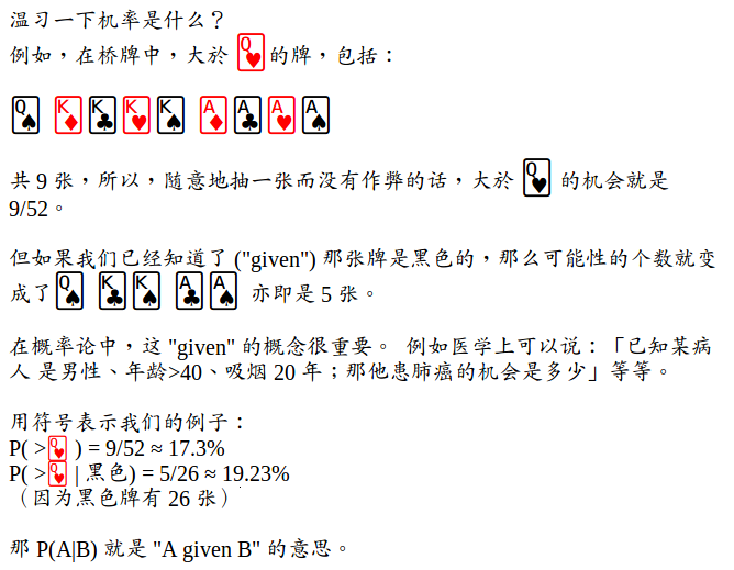 他发现了一个公式可以用来计算 P(X|Y) 那样的机率 :