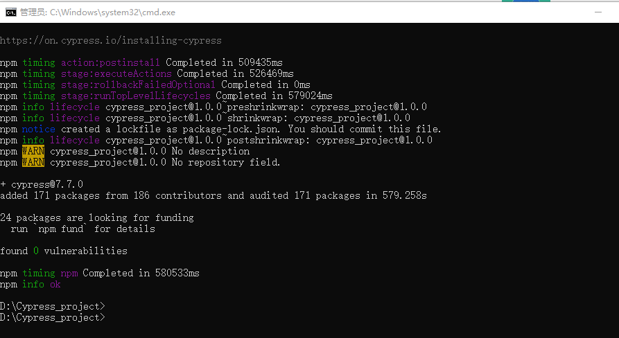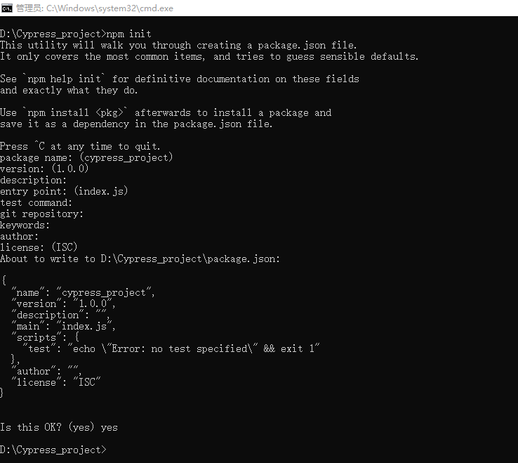 2)cmd窗口cd进该文件夹,初始化该项目:npm init;一直敲回车就行,最后输入yes