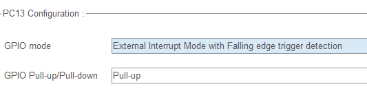 因此改为中断模式更好,此时需要将引脚由GPIO_OUT 改为GPIO_EXTI模式并且打开上拉电阻设置,边缘下降沿触发