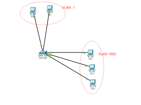我们将PC0和PC1放在同一VLAN 1中,PC2、PC3、PC4放在同一VLAN 1002 中。