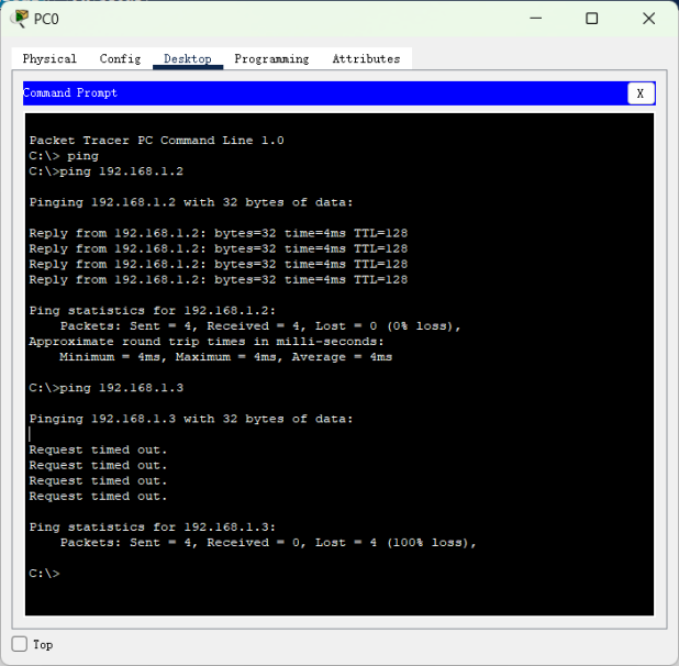 我们用PC0去pingPC1,可以发现在同一个VLAN中是可以ping通的,再用PC0去pingPC2,可以发现在不是同一个VLAN中是不可以ping通的。