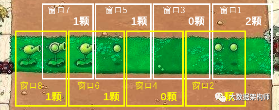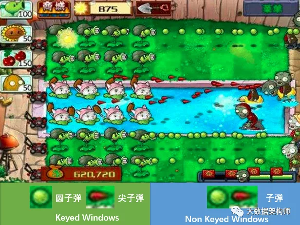 Flink是怎么解决这个问题的呢?很简单,设置一个固定的观察窗口,不停的计算窗口内的豌豆子弹数就可以了。这样就把无限数据流,变成有限数据块了。这样问题就解决了。