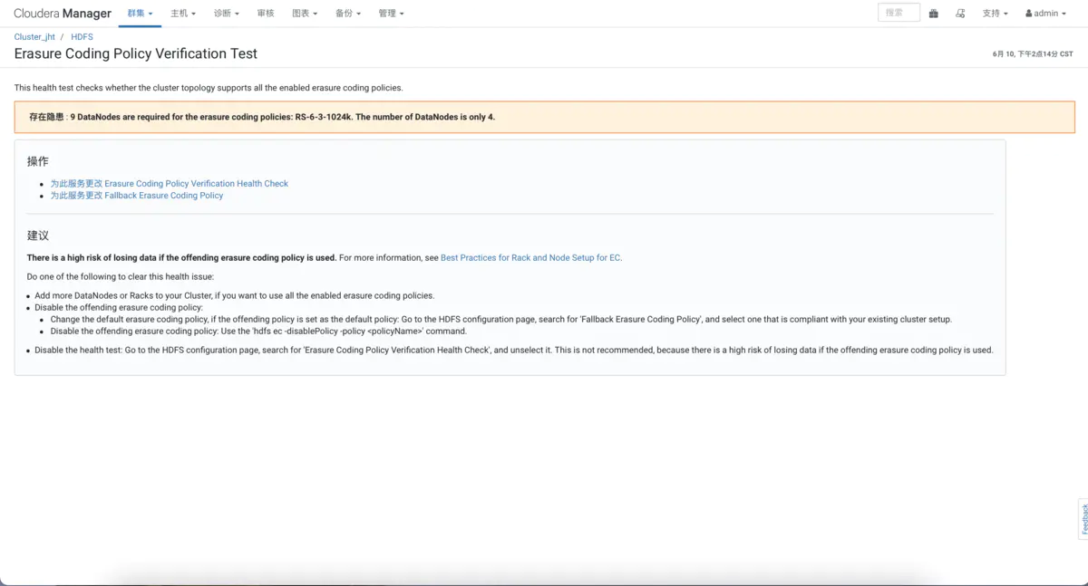 这个隐患说的是:使用RS-6-3-1024k编码纠删码策略至少需要9个DataNodes,当前只安装了4个。