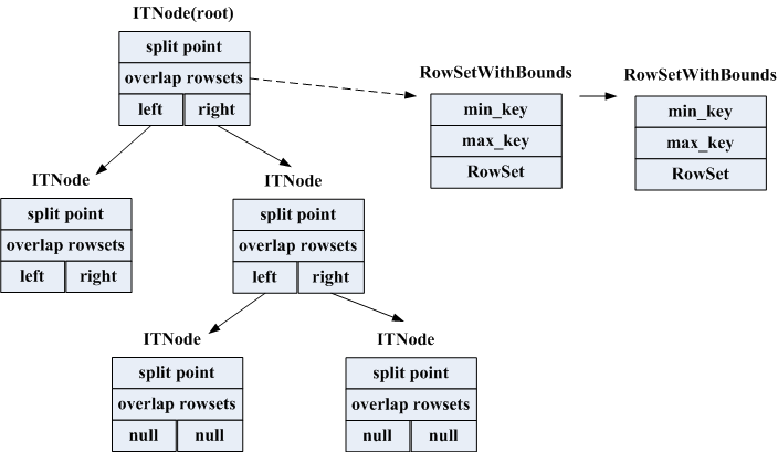 其实就是一个二叉平衡树,每次从所有range(最小的min_key跟最大的max_key)的中间key做split,将range跨域左右子树的DiskRowSet(即split point落在DiskRowSet的min_key与max_key之间)放到overlap rowsets中去。这颗树实现的也很简单,因为它只做查询用,生成后就不会变动,若遇到MemRowSet flush或DiskRowSet Merge Compaction就直接重新生成一颗新树。