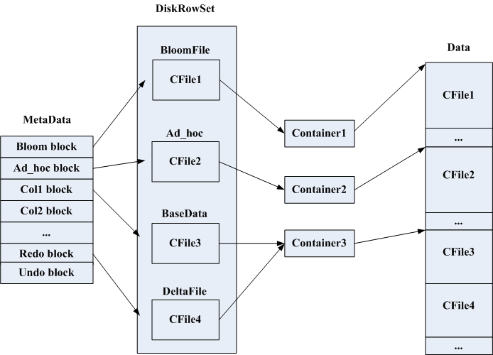 在磁盘上每个DiskRowSet有若干个.metadata及.data文件,metadata文件记录的是DiskRowSet的元信息,主要包括哪些block及block在data中的位置,上图为block与DiskRowSet中各部分的映射关系,在写磁盘是通过container来写,每个container可以写很大一块连续的磁盘空间,用于给某个CFile写数据,当一个CFile写完后会将container归还给BlockManager,这时container就可以用于下个CFile写数据了,当BlockManager中没有container可用时会新建一个container给新来的CFile使用。