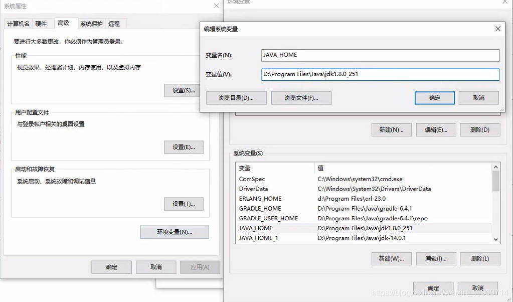 (1)打开环境变量配置。计算机→属性→高级系统设置→高级→环境变量,在系统变量中配置。