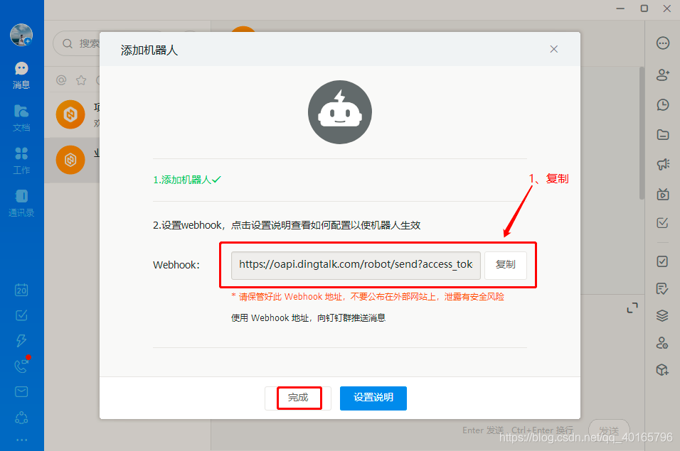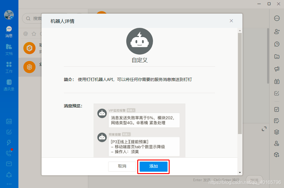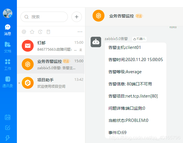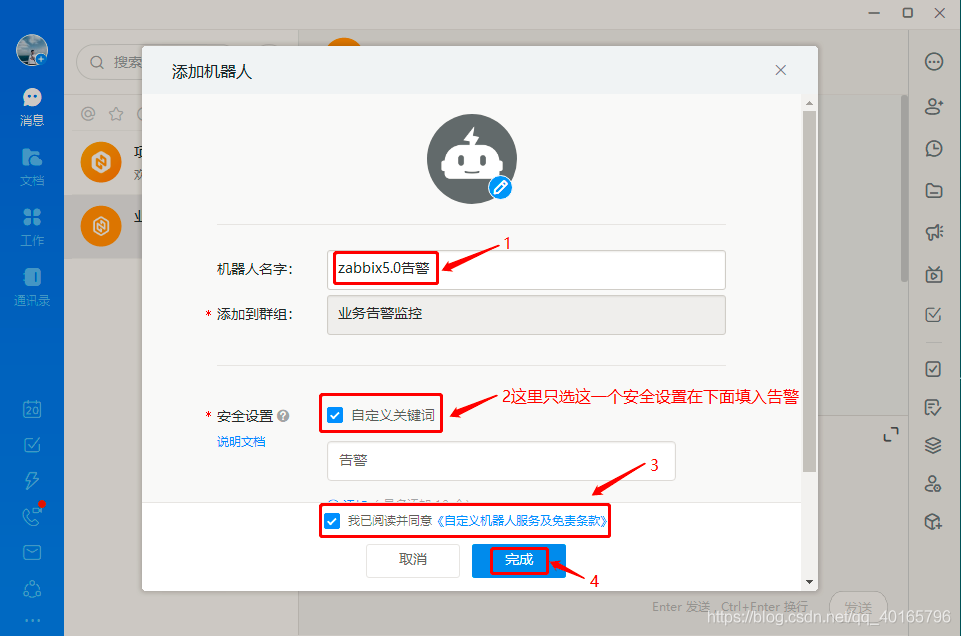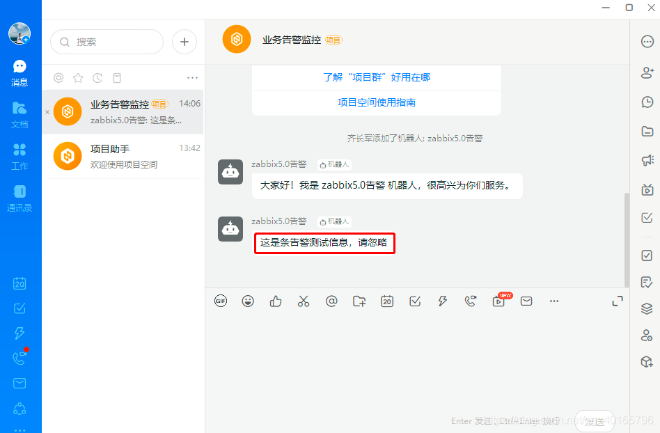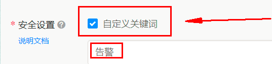 中自己设置的“自定义关键词”,否则无法发送告警信息,我这里设置的告警关键字是"告警"。