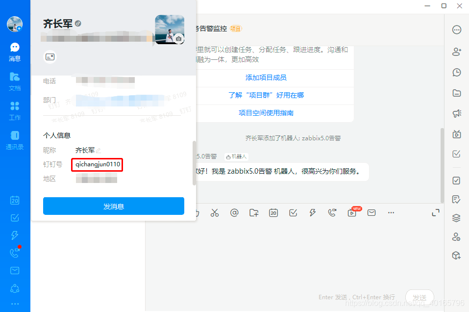 1)qichangjun0110:钉钉群中任意一个人员的钉钉号。