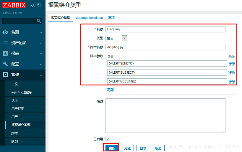 #说明:以下脚本只要将webhook改为你自己的webhook值即可,其它的不需要改变。 #!/usr/bin/python #-*- coding: utf-8 -*- #zabbix钉钉报警 import requests,json,sys,os,datetime webhook="https://oapi.dingtalk.com/robot/send?access_token=feb43aea482d9da72e781d92dbfc074f701642a166f31194ff347954f500a404" #说明:这里改为自己创建的机器人的webhook的值 user=sys.argv[1] #发给钉钉群中哪个用户 text=sys.argv[3] #发送的报警内容 data={ "msgtype": "text", "text": { "content": text }, "at": { "atMobiles": [ user ], "isAtAll": False } } #钉钉API固定数据格式 headers = {'Content-Type': 'application/json'} x=requests.post(url=webhook,data=json.dumps(data),headers=headers) if os.path.exists("/var/log/zabbix/dingding.log"): f=open("/var/log/zabbix/dingding.log","a+") else: f=open("/var/log/zabbix/dingding.log","w+") f.write("\n"+"--"*30) if x.json()["errcode"] == 0: f.write("\n"+str(datetime.datetime.now())+" "+str(user)+" "+"发送成功"+"\n"+str(text)) f.close() else: f.write("\n"+str(datetime.datetime.now()) + " " + str(user) + " " + "发送失败" + "\n" + str(text)) f.close() #将发送的告警信息写入本地日志/var/log/zabbix/dingding.log中