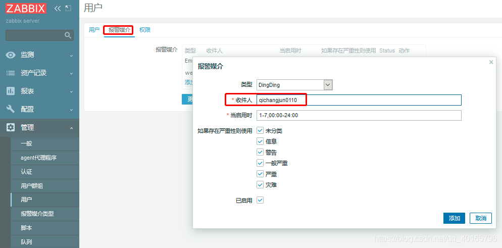 特别注意:这里只需要添加钉钉群里的任何一个成员的钉钉账号即可,即添加一个收件人,这样在机器人群里成员都能看到告警信息.