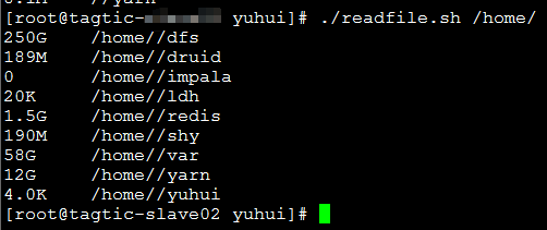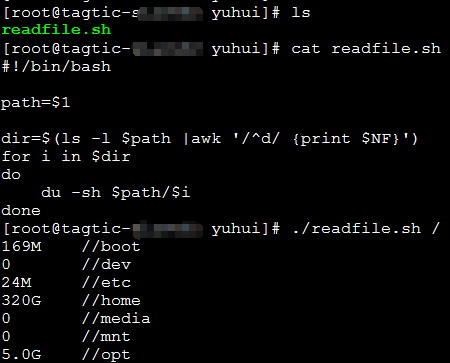 #!/bin/bash path=$1 dir=$(ls -l $path |awk '/^d/ {print $NF}') for i in $dir do du -sh $path/$i done