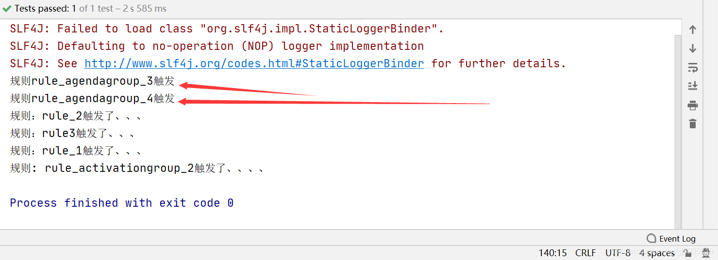 //当前规则文件用于测试activation-group属性 package testactivationgroup rule "rule_activationgroup_1" activation-group "mygroup" //对于同一个组内的规则,只能有一个触发 salience 5 when //如果条件不写,默认为true,表示规则匹配成功 then System.out.println("规则: rule_activationgroup_1触发了、、、、"); end rule "rule_activationgroup_2" activation-group "mygroup" salience 10 when //如果条件不写,默认为true,表示规则匹配成功 then System.out.println("规则: rule_activationgroup_2触发了、、、、"); end