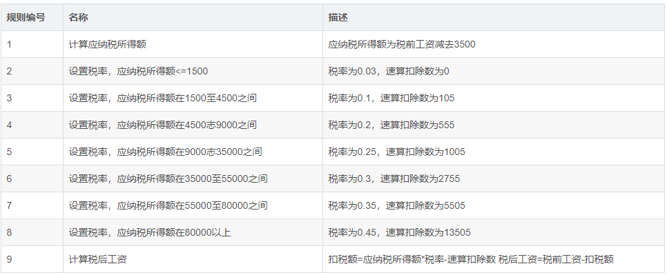 //当前规则文件用于计算个人所得税 package calculation import com.itheima.drools.entity.Calculation /** 当前规则文件中的规划主要分为三类 1、计算应纳税所得额 2、设置税率、速算扣除数 3、计算税后工资 */ //计算应缴税所得额 rule "计算应缴纳所得额" salience 100 date-effective "2011-09-01" no-loop true when $cal:Calculation(wage > 0) then double wagemore = $cal.getWage() - 3500; $cal.setWagemore(wagemore); update($cal) end //设置税率、速算扣除数 rule "设置税率,应纳税所得额<=1500" salience 3 no-loop true when $cal:Calculation(wagemore <= 1500) then $cal.setCess(0.03); //税率 $cal.setPreminus(0); //速算扣除数 update($cal) end //设置税率、速算扣除数 rule "设置税率,应纳税所得额在1500至4500之间" salience 2 no-loop true activation-group "SETCess_Group" when $cal:Calculation(wagemore > 1500 && wagemore <= 4500 ) then $cal.setCess(0.1); //税率 $cal.setPreminus(105); //速算扣除数 update($cal) end rule "个人所得税:设置税率-->>应纳税所得额在4500志9000之间" salience 2 no-loop true activation-group "SETCess_Group" when $cal : Calculation(wagemore > 4500 && wagemore <= 9000) then $cal.setCess(0.2); $cal.setPreminus(555); update($cal); end rule "个人所得税:设置税率-->>应纳税所得额在9000志35000之间" salience 2 no-loop true activation-group "SETCess_Group" when $cal : Calculation(wagemore > 9000 && wagemore <= 35000) then $cal.setCess(0.25); $cal.setPreminus(1005); update($cal); end rule "个人所得税:设置税率-->>应纳税所得额在35000至55000之间" salience 2 no-loop true activation-group "SETCess_Group" when $cal : Calculation(wagemore > 35000 && wagemore <= 55000) then $cal.setCess(0.3); $cal.setPreminus(2755); update($cal); end rule "个人所得税:设置税率-->>应纳税所得额在55000至80000之间" salience 2 no-loop true activation-group "SETCess_Group" when $cal : Calculation(wagemore > 55000 && wagemore <= 80000) then $cal.setCess(0.35); $cal.setPreminus(5505); update($cal); end rule "个人所得税:设置税率-->>应纳税所得额在80000以上" salience 2 no-loop true activation-group "SETCess_Group" when $cal : Calculation(wagemore > 80000) then $cal.setCess(0.45); $cal.setPreminus(13505); update($cal); end rule "个人所得税:计算税后工资" salience 1 when $cal : Calculation(wage > 0 && wagemore > 0 && wagemore > 0 && cess > 0) then $cal.setWageminus($cal.getWagemore()*$cal.getCess()-$cal.getPreminus()); $cal.setActualwage($cal.getWage()-$cal.getWageminus()); System.out.println("-----税前工资:"+$cal.getWage()); System.out.println("-----应纳税所得额:"+$cal.getWagemore()); System.out.println("-----税率:" + $cal.getCess()); System.out.println("-----速算扣除数:" + $cal.getPreminus()); System.out.println("-----扣税额:" + $cal.getWageminus()); System.out.println("-----税后工资:" + $cal.getActualwage()); end