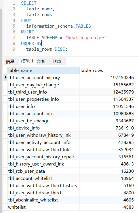 select table_name,table_rows from information_schema.tables where TABLE_SCHEMA = '库名' order by table_rows desc;
