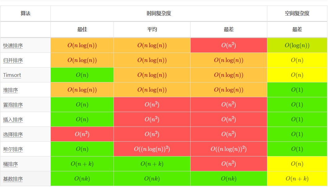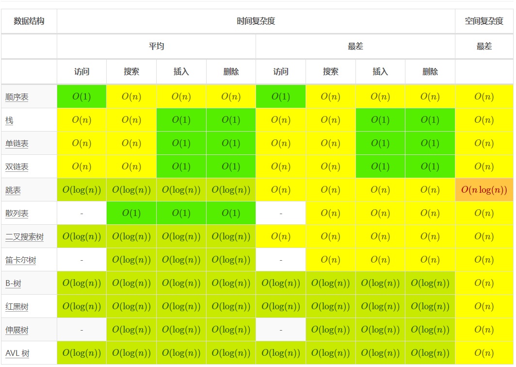 复杂度通常会使用大-O 记号来表示,比如快速排序的平均时间复杂度是 O(nlog(n))。虽然我是「理解派」,但是虽然每个算法/数据结构都理解了,不时仍有可能忘记具体某个算法/数据结构的复杂度(特别是在最好、最坏和平均情形下的复杂度)。因此制作一个速查表是蛮有必要的。