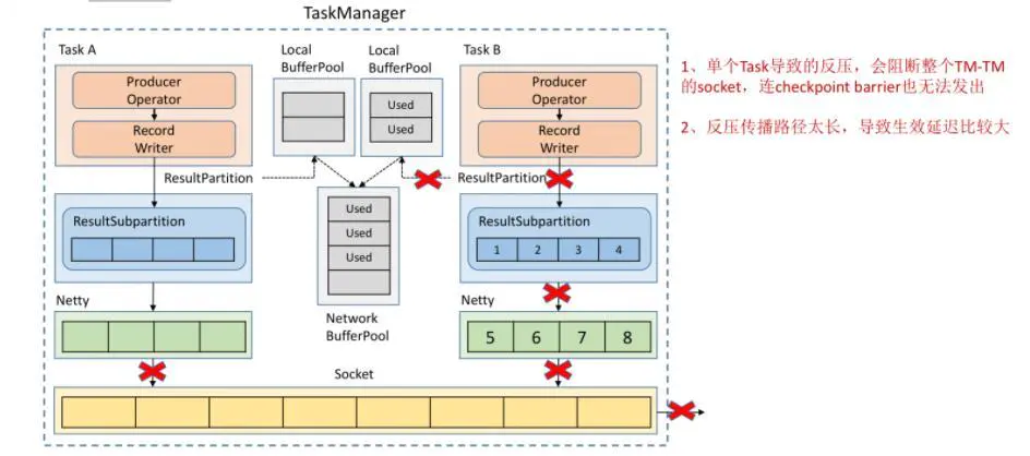 ① 单个Task的反压,阻塞了整个TaskManager的socket,导致checkpoint barrier也无法传播,最终导致checkpoint时间增长甚至checkpoint超时失败。