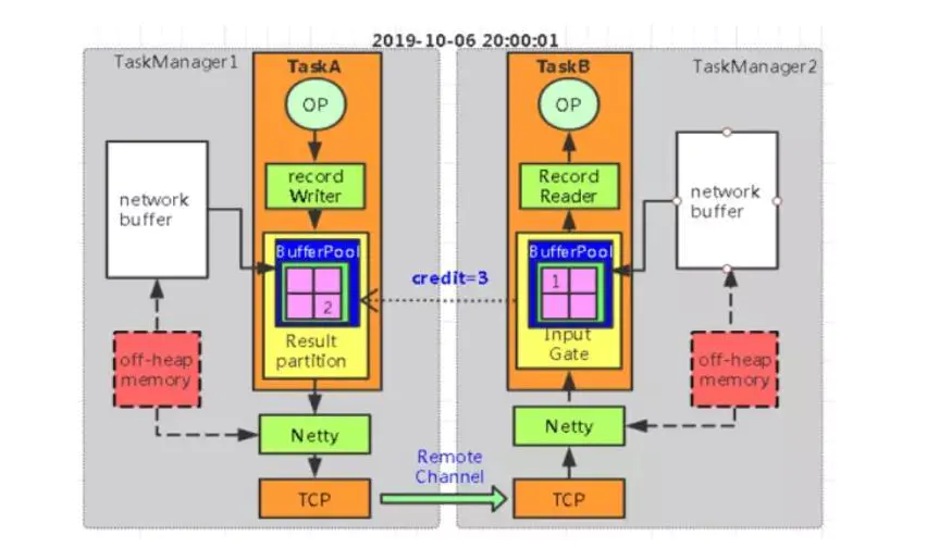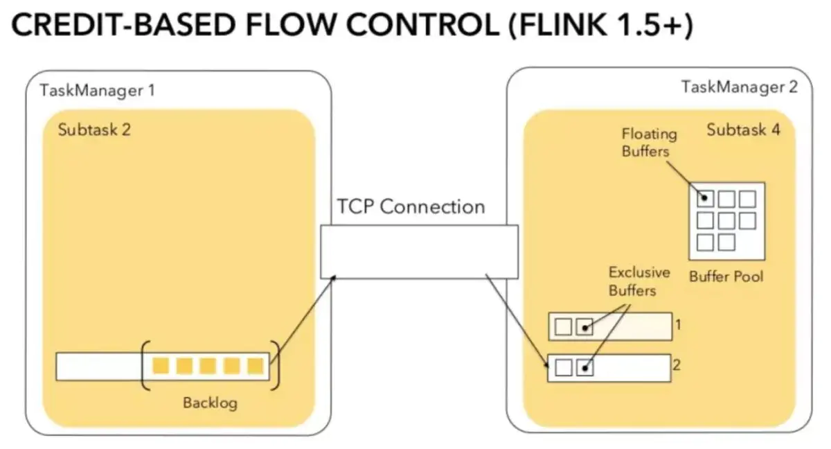 ① TaskManager 之间的数据传输 不同的 TaskManager 上的两个 Subtask 通常情况下,channel 数量等于分组 key 的数量或者等于算子并发度。这些 channel 会复用同一个 TaskManager 进程的 TCP 请求,并且共享接收端 Subtask 级别的 Buffer Pool。 ② 接收端 每个 channel 在初始阶段会被分配固定数量的独享 Exclusive Buffer,用于存储接收到的数据。算子 Operator 使用后再次释放 Exclusive Buffer。说明:channel 接收端空闲的 Buffer 数量称为 Credit,Credit 会被定时同步给发送端,用于决定发送多少个 Buffer 的数据。 ③ 流量较大的场景 接收端,channel 写满 Exclusive Buffer 后,Flink 会向 Buffer Pool 申请剩余的 Floating Buffer。发送端,一个 Subtask 所有的 Channel 会共享同一个 Buffer Pool,因此不区分 Exclusive Buffer 和 Floating Buffer。