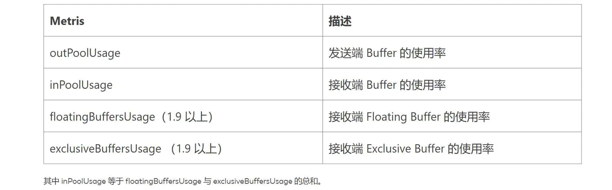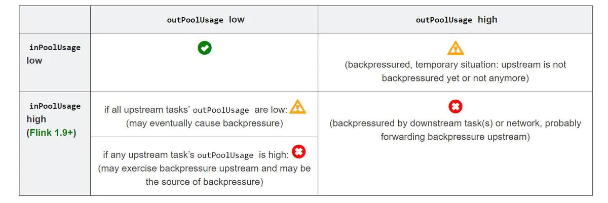 ① outPoolUsage 和 inPoolUsage 同为低表明当前 Subtask 是正常的,同为高分别表明当前 Subtask 被下游反压。